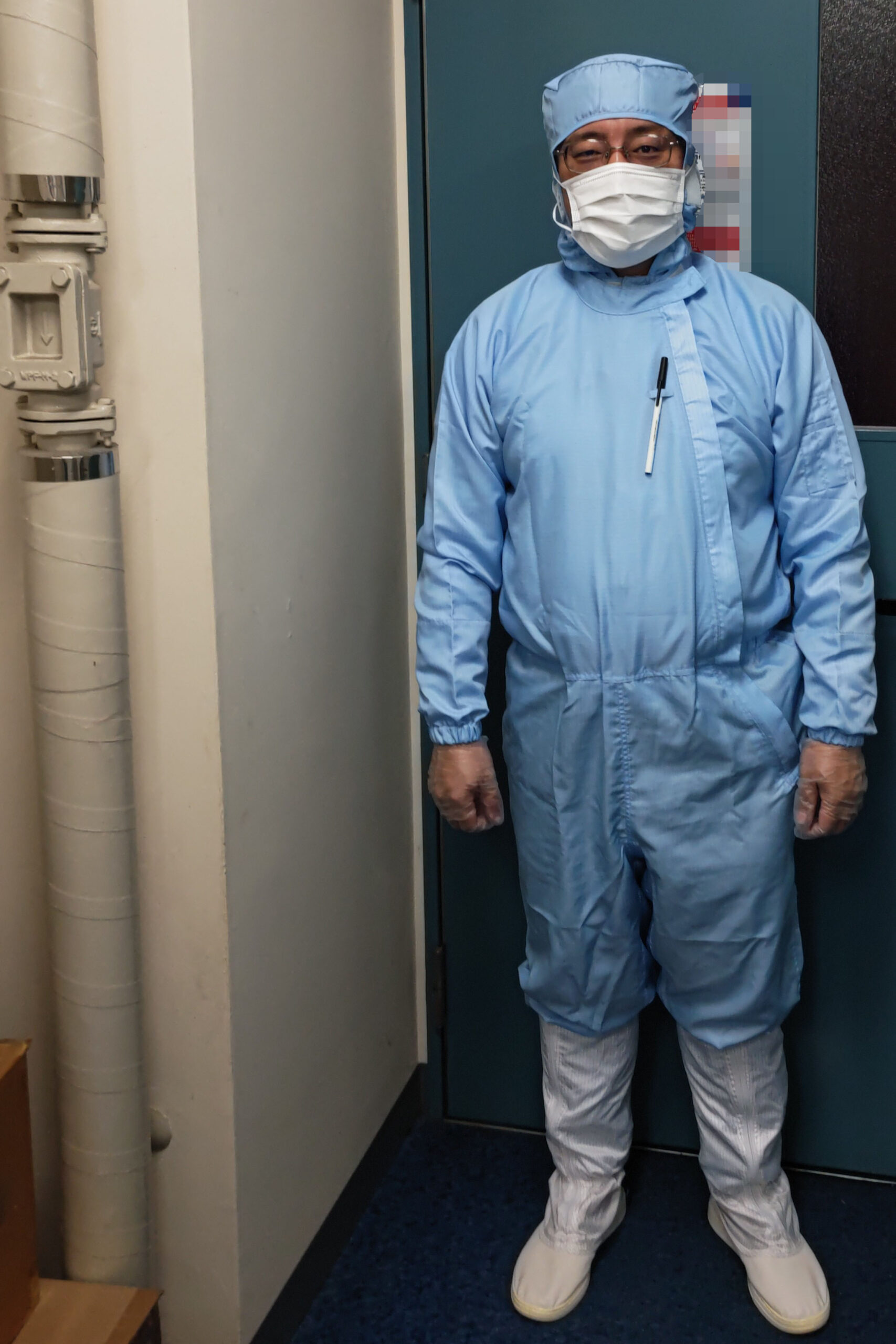 クリーンルーム内へは、クリーンウェア(防塵服・無塵服)を着て入ります。手は手袋、足はブーツ、そして繋ぎのクリーンウェアにマスクで、露出は目元だけに限ります。人間が一番の塵発生源となるからです。ペンもボールペンです。鉛筆やシャープペンシルでは、黒鉛の粉が飛散します。