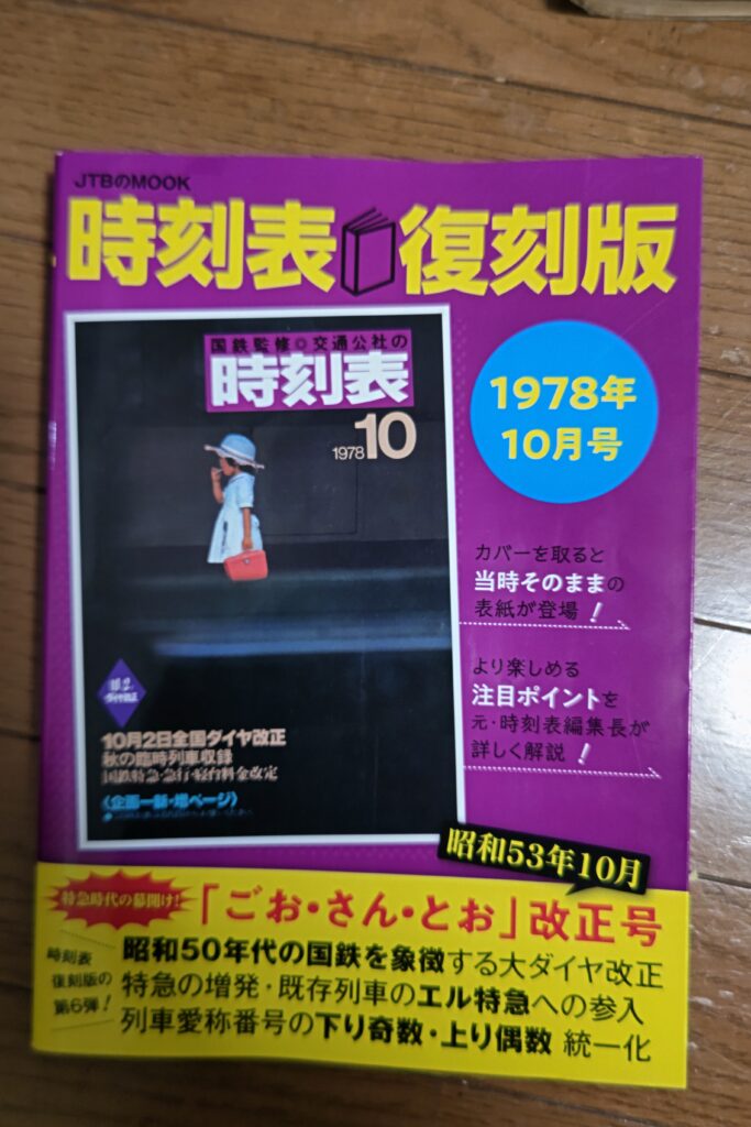 時刻表は、隠れたベストセラーと言われています。昨今は、生まれる以前の時刻表でダイヤ改正など記念すべき号のものが復刊されています。もちろんそれも集めており、最近1978年(昭和53年)10月号を手に入れました。世に言う「ゴーサントオ」ダイヤ改正号です。この改正から、現在に至る特急列車の号数整備(奇数号は下り、偶数号は上り)などが始まりました。これ以前の号は、ちょっと感覚が合わないところがあります。ゴーサントオは東北・上越新幹線が開通する直前で、これら地方の在来線特急・寝台列車が最も輝いていた時代です。この号は表紙が有名なため、祖父母宅にあったような記憶がありますが、幼すぎて定かではありません。