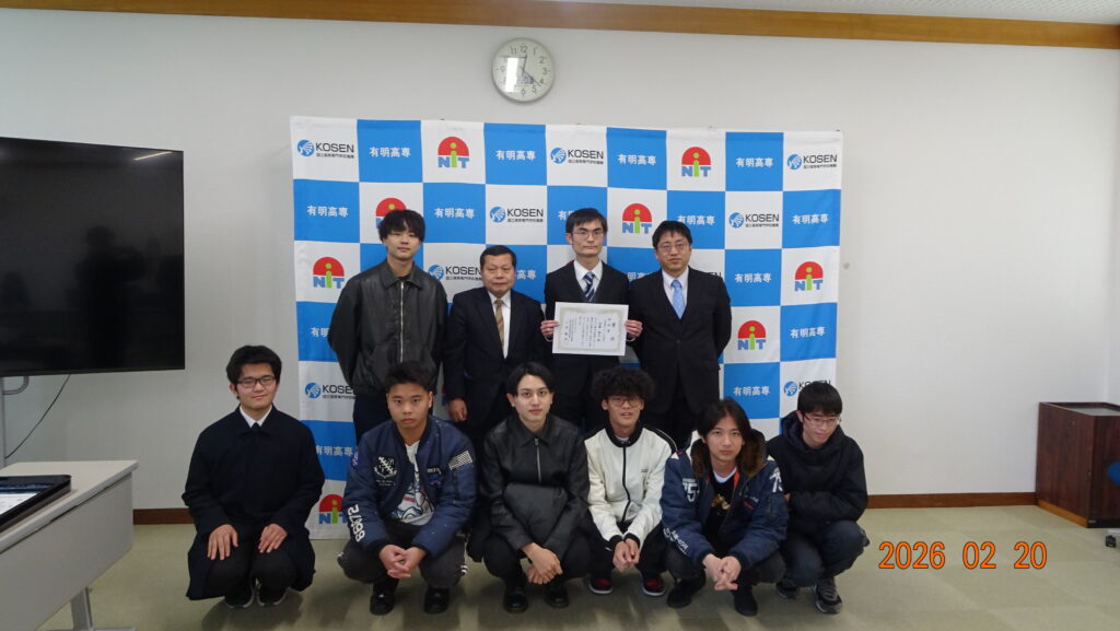 ∩(´∀`∩) 7E 内藤 陽大君、有明高専特別賞受賞!! (∩´∀`)∩ 2026年2月20日 鷹林 将未分類 No Comments 本日2/20(金)は終業式でした。全クラスオンラインで繋いでの全校集会にて、7E 内藤 陽大君が有明高専の特別賞を他コース4グループと共に受賞したことが公表されました。3年半の研究室生活における学会受賞を含む数多くの研究実績、加えて下級生への指導実績が高く評価されましたっ!! \(゚▽゚=))/…\((=゚▽゚)/ 正に不断の努力の賜物です。特に内藤君に対しては3年次副担任、4・5年次正担任でもあったため、喜びもひとしおです。 研究室では昨年の福田君に続いて連続の受賞です。 校長先生を交えて研究室全メンバーで記念写真です。 Views: 3