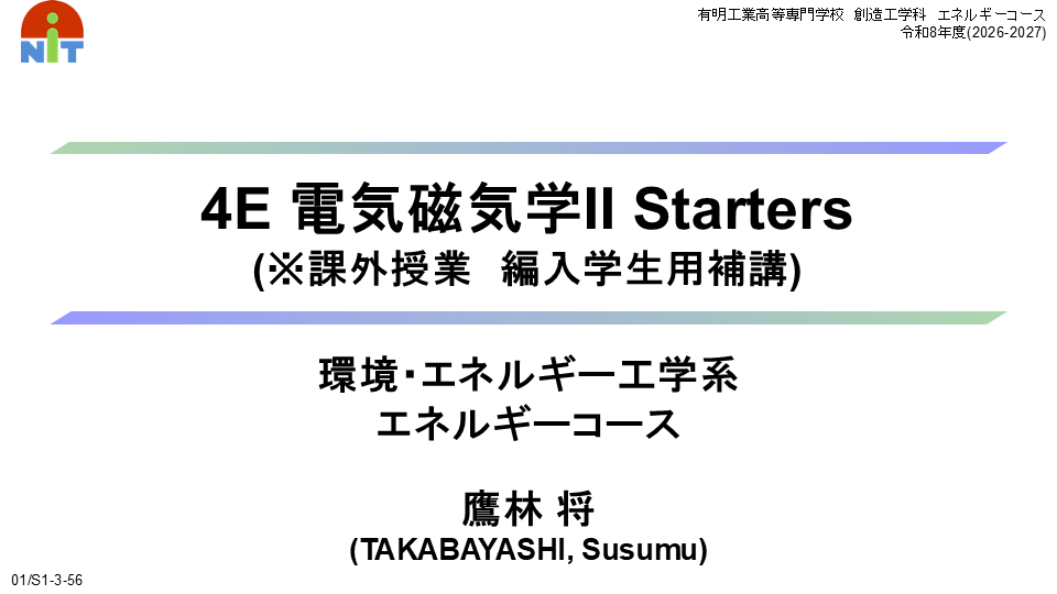 私が着任以来担当している電気磁気学(電磁気学)では、3年(3E)次の間にベクトル解析を済ませて、Maxwell方程式の一つである電界に関するガウスの法則(div D = ρ)まで導出しています。続く4年(4E)次では、Maxwell方程式を完成させて、その応用として表皮効果や電磁波を導いています。ローレンツ力を導く相対論的Maxwell方程式やゲージ変換は時間的に無理なので、希望者に補講しています。ここまでしないと収まりが悪くて。電磁波の反射と屈折、エバネッセント波、導波管(ヘルムホルツ方程式)は、専攻科1年(6E)次において、ネットワークアナライザの実習がてら講義しています。