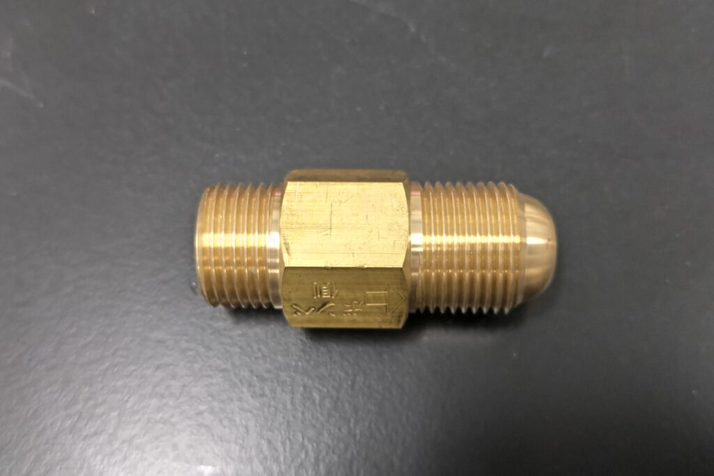 九州の現環境では、G1純度のものはドイツ式なのですが、汎用のものはフランス式になっています。こちらへ来て、初めてフランス式を体験することになりました。ガスレギュレータはドイツ式に対応していますので、変換アダプタ(継手)が必要です。これは通称、「オンソケ」と呼ばれています。パッキンとは違って、繰り返し使用できます。
