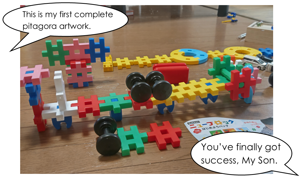 2025/10 お息子さん、ピタゴラスイッチ完成: ピ ニューブロック 3D 完成。